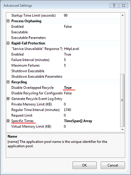 IIS recycelt alle Anwendungspools automatisch in bestimmten Zeitintervallen, um die Stabilität zu verbessern. Die Recycling Einstellungen für aquaWebservicePool müssen folgendermaßen überarbeitet werden: