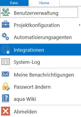 Sie können verschiedene Integrationen in aqua für aqua konfigurieren. Damit können Sie zusätzliche Werkzeuge und Funktionalitäten verbinden. Um eine neue Integration zu erstellen, klicken Sie auf 'Datei' --> 'Integrationen'.