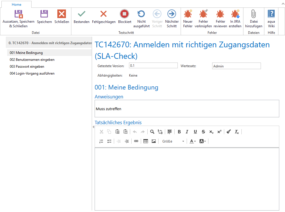 Ein neuer Tab zeigt Schritt für Schritt die Aufgaben an, die im Testfall durchgeführt werden müssen. Der folgende Screenshot zeigt einen Bedingungsschritt. Dokumentieren Sie das aktuelle Verhalten in Tatsächliches Ergebnis.