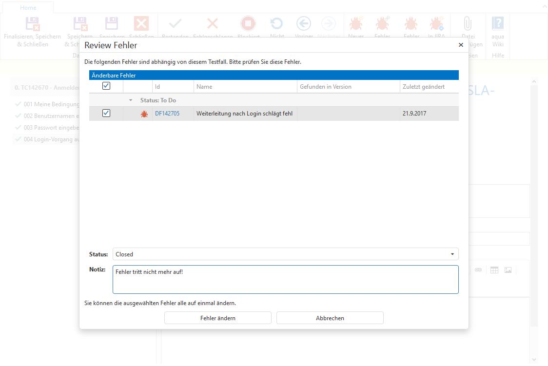 In aqua Web haben Sie die Möglichkeit, abhängige Fehler während einer Testausführung zu prüfen. So können Sie einfach überprüfen, ob der Fehler behoben wurde, während Sie ihn nachtesten.