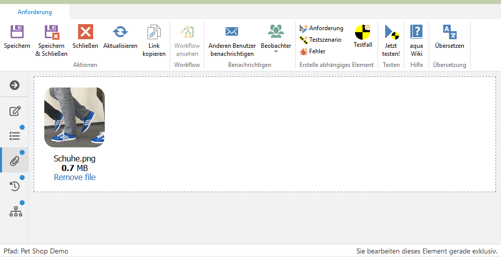 Sie können Anhänge zu Elementen oder Ausführungen in aqua Web hinzufügen. Dafür öffnen Sie ein Element und klicken auf Dateien in der unteren Leiste. Hier können Sie einfach Ihre Dateien hineinziehen oder in den grauen Bereich klicken, um nach einer Datei zu suchen.