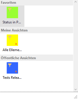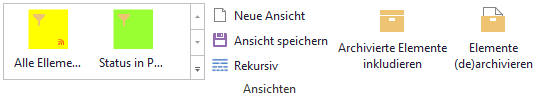 Sie sehen die Ansichten strukturiert innerhalb des 'Ansichten' Abschnitts im Ribbon. In der ersten Zeile finden Sie die Ansichten, die Sie als Favorit markiert haben. Darunter sind Ihre persönlichen Ansichten und ganz unten die öffentlichen Ansichten anderer Nutzer.