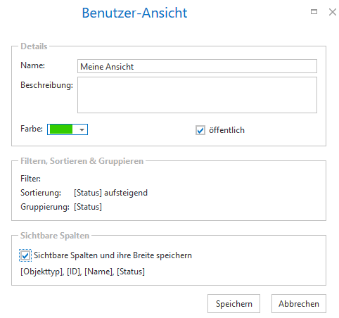 Sobald Ihre Ansicht so aussieht, wie gewünscht, klicken Sie auf 'Neue Ansicht'. Ein Fenster öffnet sich, in dem Sie die Ansicht definieren können, zum Beispiel ob Sie öffentlich sein soll. Öffentliche Ansichten können von allen Nutzern im Projekt angewandt werden.