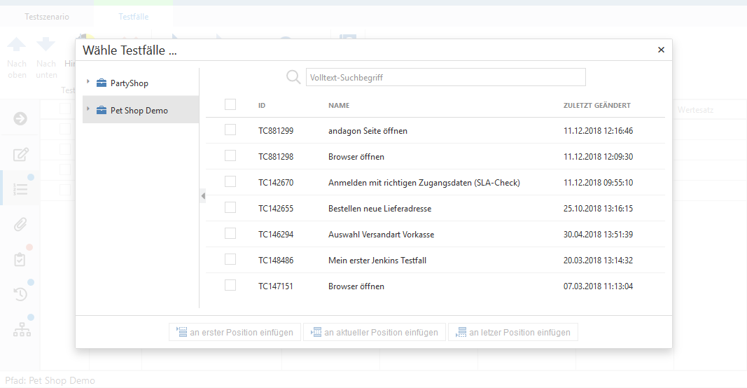 Ein Dialog öffnet sich, in welchem Sie alle Testfälle im Projekt sehen können. Sie können entweder nach einem bestimmten Testfall suchen oder einen der vordefinierten Filter benutzen. Wenn Sie einen Testfall auswählen, können Sie diesen entweder am Anfang oder am Ende des Testszenarios einfügen. Nachdem alle gewünschten Testfälle hinzugefügt wurden, können Sie Ihr Szenario speichern.