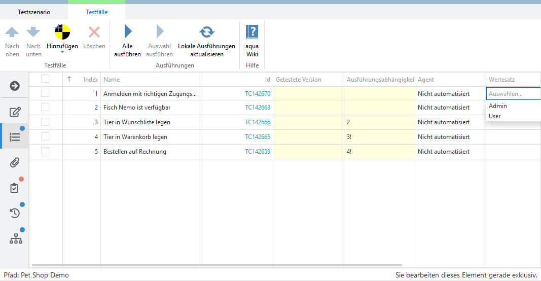 Wenn ein Testfall parametrisiert ist, wird der Standard-Wertesatz automatisch eingetragen. Alle anderen Wertesätze können über einen Klick auf Wert im Bereich Testfälle und die Auswahl des Wertes von der Auswahlliste, hinzugefügt werden.