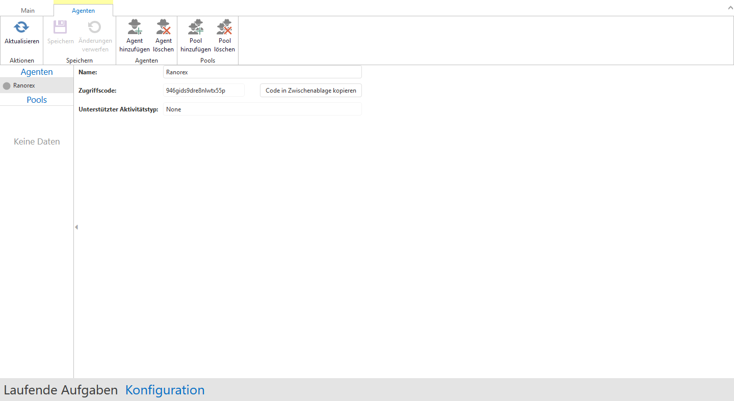 Der Zugriffscode wird automatisch generiert und wird für die Konfiguration eines Agenten benötigt. Dafür kopieren Sie den Zugriffscode in die Zwischenablage oder schreiben Ihn auf, um Ihn später zu verwenden. Der Zugriffscode dient zur Identifizierung und Ansteuerung des richtigen Agenten. Es dürfen niemals zwei oder mehr Agenten mit dem gleichen Zugriffscode konfiguriert werden.