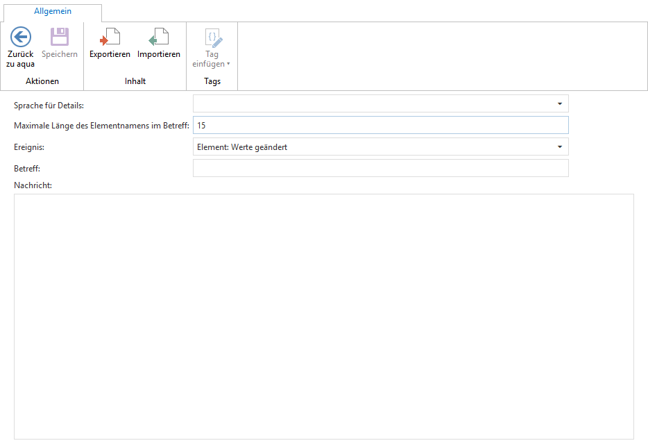 Den Text der E-Mail Nachrichten können Sie in aqua definieren. Dazu wählen Sie ein Projekt aus und klicken auf "Datei" --> "Projektvorlage (Benachrichtigungsvorlagen)". Hier können Sie Sprache, Betreff und Nachrichtentext definieren.