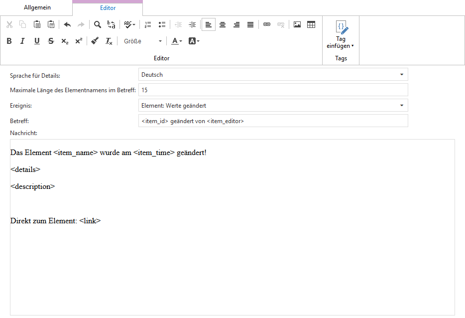 Über den Button Tag einfügen können Sie verschiedene Platzhalter definieren. Die Platzhalter werden zur Laufzeit mit den jeweiligen Informationen ersetzt.