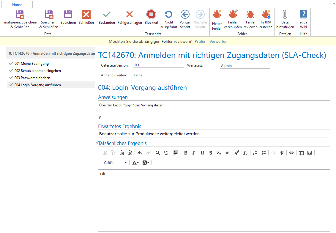 Ein neuer Tab zeigt Schritt für Schritt die Aufgaben an, die im Testfall durchgeführt werden müssen. Der folgende Screenshot zeigt einen Bedingungsschritt. Dokumentieren Sie das aktuelle Verhalten in Tatsächliches Ergebnis.
