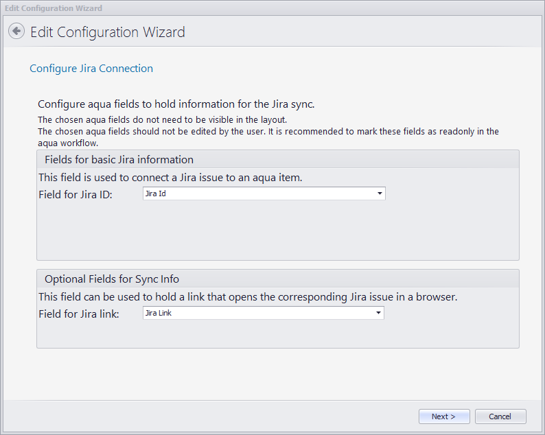 Der nächste Schritt informiert den Benutzer, dass der Assistent beide aqua und JIRA-Projekte gefunden hat, und dass die Konfigurationsdetails (so wie benutzerdefinierte Felder und Werte) geladen wurden. Klicken Sie auf Weiter >.