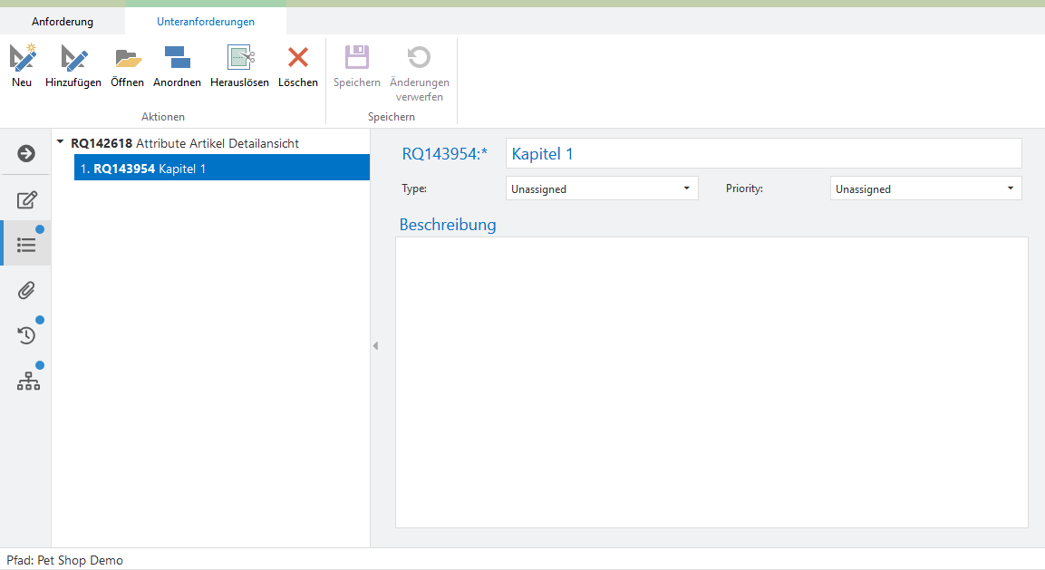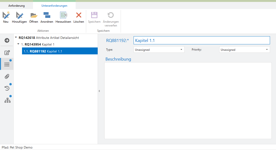 Hier können Sie neue Kapitel erstellen. Klicken Sie auf um eine neue Unteranforderung zu erstellen. Wir können dies in Kapitel 1 spezifizieren.