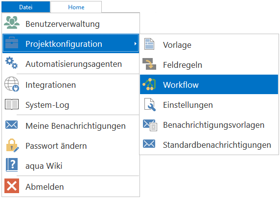 In aqua können Sie einen Workflow für ein bestimmtes Projekt erstellen. Um den Workflow eines Status zu konfigurieren, öffnen Sie die Projektkonfiguration (Workflow).