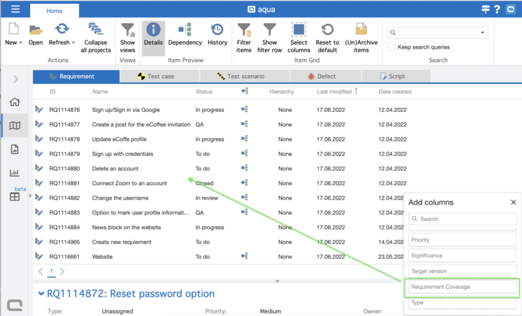 Schritt 4: Bewegen Sie den Mauszeiger über die Spalte „Anforderungsabdeckung“ und klicken
