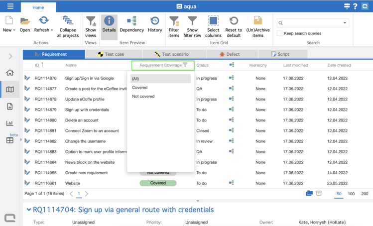 Schritt 5: Wenn Sie Ihre Anforderungen im Raster nach dem Status „Anforderungsabdeckung“