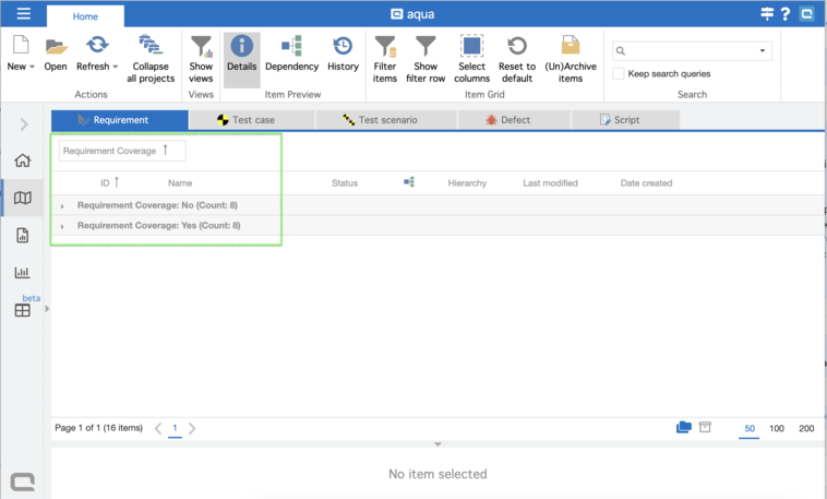 Der Status „Anforderungsabdeckung“ erscheint, wenn mindestens ein Testfall oder ein Testszenario als Abhängigkeit zur Anforderung hinzugefügt wurde.