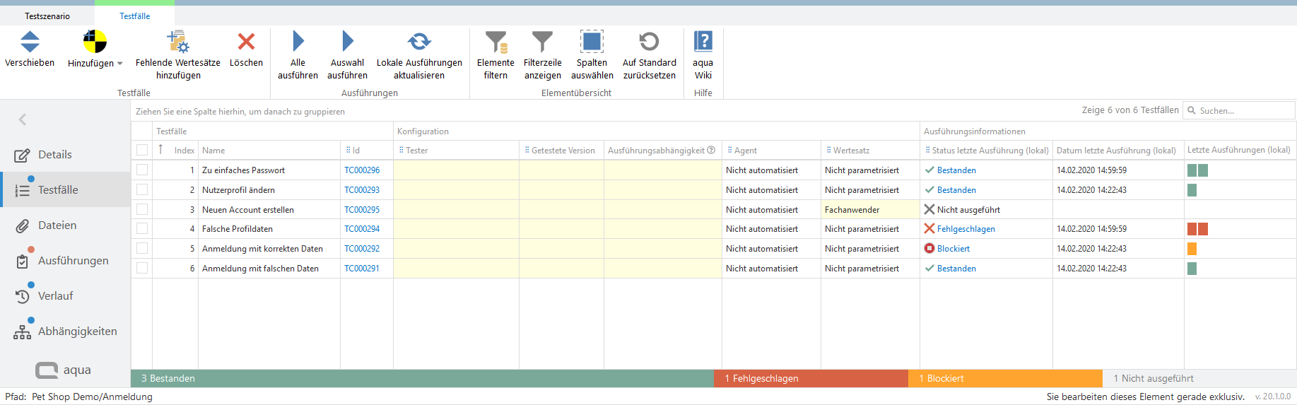 Sie finden Informationen bezüglich der letzten lokalen Ausführungen innerhalb des Testszenarios unter Testfälle.