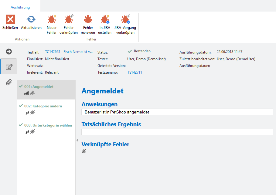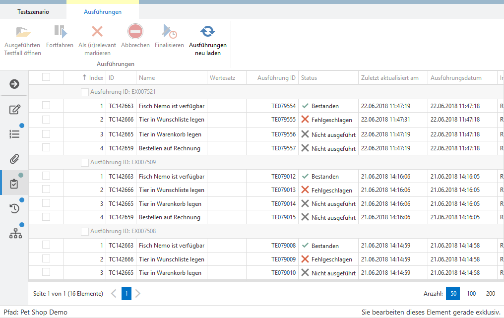 Detaillierte Informationen bezüglich der letzten Ausführungen finden Sie im Reiter Ausführungen. Hier sind alle bisherigen Ausführungen tabellarisch aufgelistet. Sie können die Ausführungen dann noch fortfahren, als irrelevant setzen, abbrechen oder finalisieren, genauso wie bei den Ausführungsergebnissen in den Testfällen selbst.