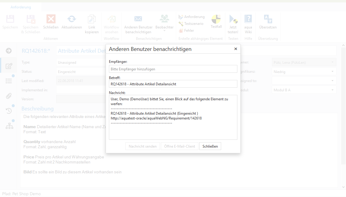 Sie können auch Kollegen wählen, die für ein bestimmtes Element benachrichtigt werden sollen, zum Beispiel wenn Sie möchten, dass jemand einen Blick auf ein Element wirft. Um dies einzurichten, öffnen Sie das Element in aqua Web.