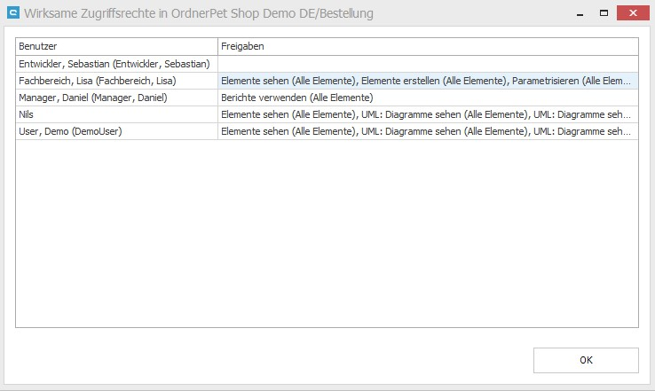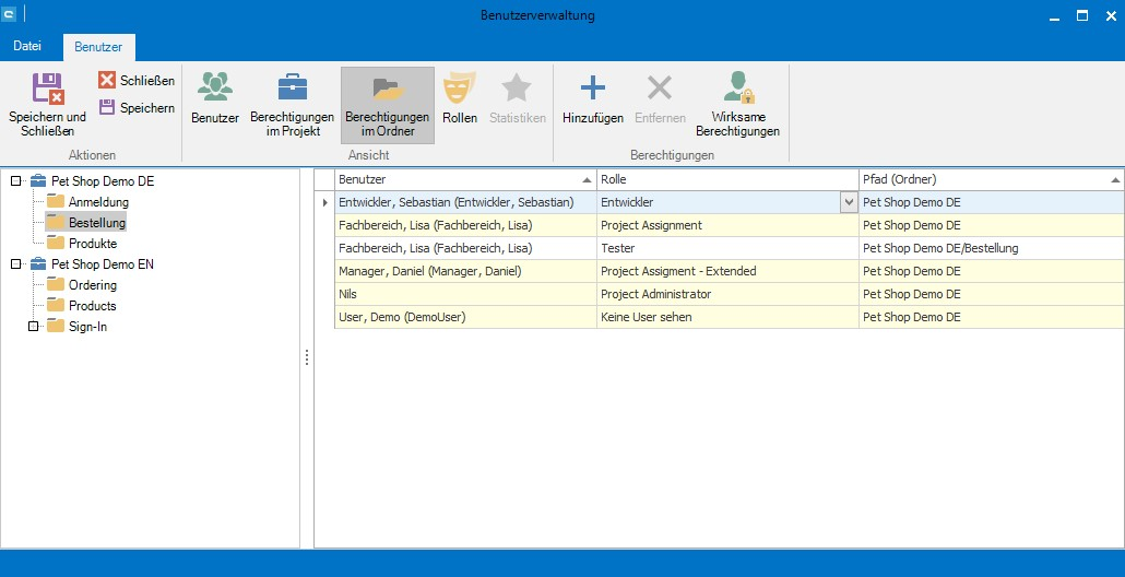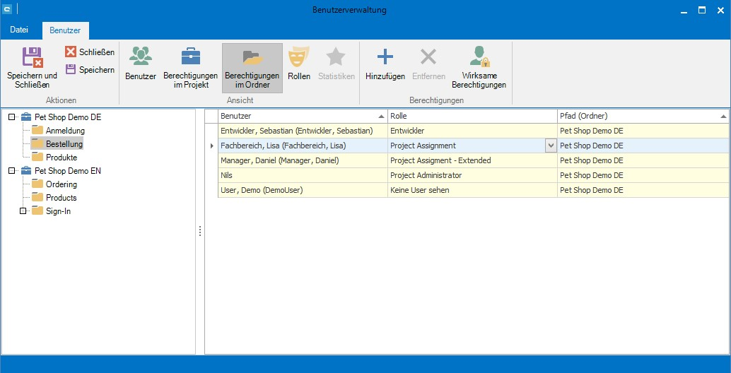 In der Übersicht sollte danach der Benutzer mehrmals stehen, einmal mit der Rolle für das Projekt und einmal mit der Rolle für den (oder die) Ordner.