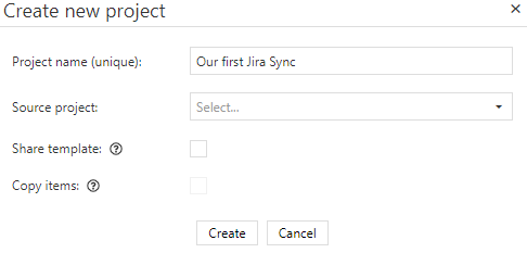 Zunächst erstellen wir das Projekt in aqua, und nennen es 'Our first Jira Sync'.