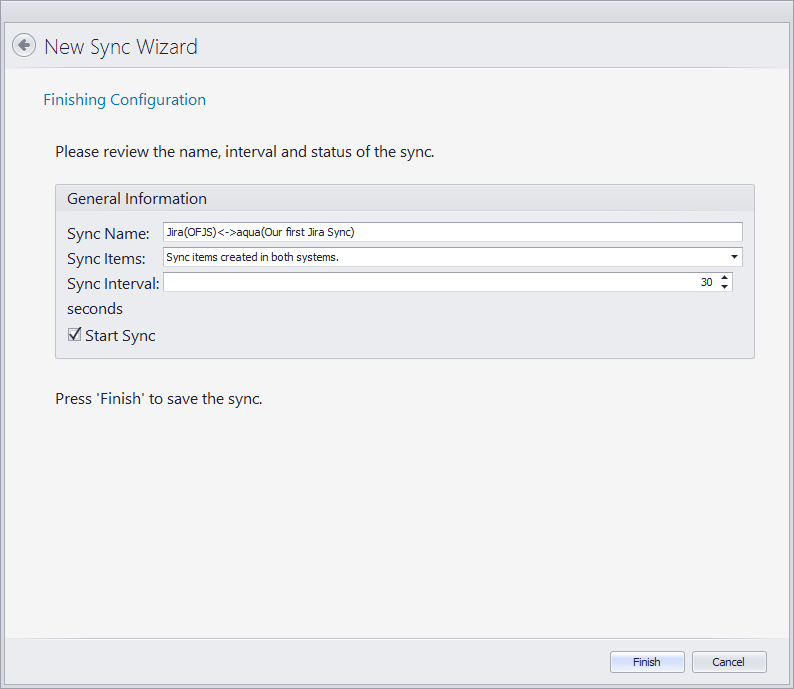 Im letzten Fenster definieren wir, in welche Richtung der Sync laufen soll (Jira zu aqua, aqua zu Jira oder beides), und den Sync Intervall.