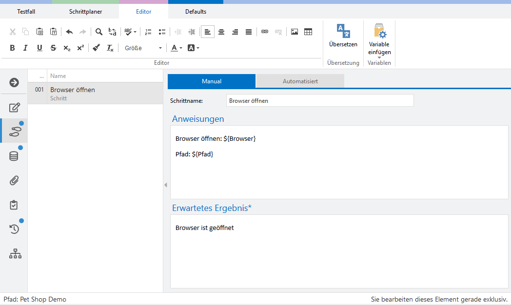 Wenn Sie den Testfall ausführen, werden die Parameter für die manuelle Testausführung automatisch gesetzt.