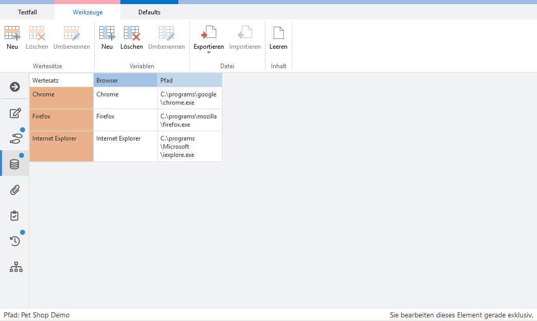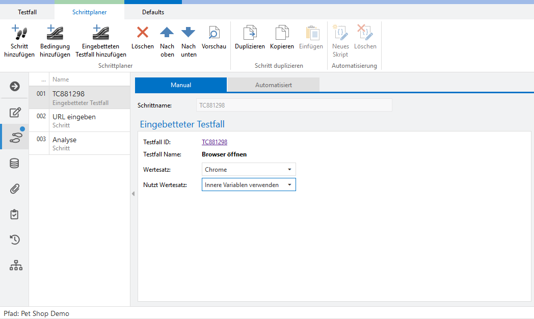 Sie werden das folgende Ergebnis erhalten. Hier können Sie definieren unter welchen Bedingungen der Testfall ausgeführt werden soll. In diesem Fall definieren Sie Chrome als innere Variable. Wenn Sie äußere Variable wählen, können Variablenwerte durch die Wertesätze des aufrufenden Testfalls überschrieben werden. Hierfür müssen Sie nur exakt gleich benannt werden.