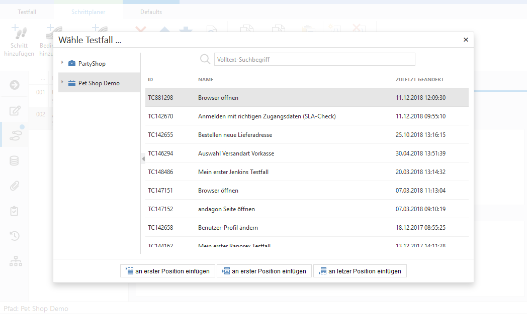 Um unsere Testschritte des Testfalls "Browser öffnen" im aktuellen Testfall "andagon Seite öffnen" einzubauen, öffnen Sie diesen und klicken auf . Eine Maske öffnet sich, in der Sie den einzubettenden Testfall auswählen, sowie die Stelle, an der dieser eingefügt werden soll.