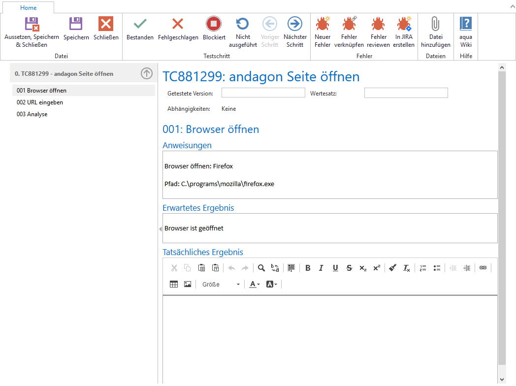 Speichern Sie den Testfall und erstellen Sie einen weiteren Testfall mit dem Namen andagon Seite öffnen. Dieser hat zwei weitere Testschritte.