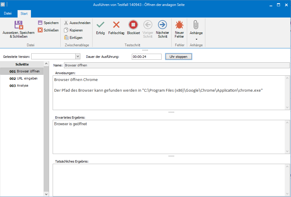 Speichern Sie den Testfall und erstellen einen neuen mit dem Namen Öffnen der andagon Seite. Dieser hat zwei weitere Testschritte.
