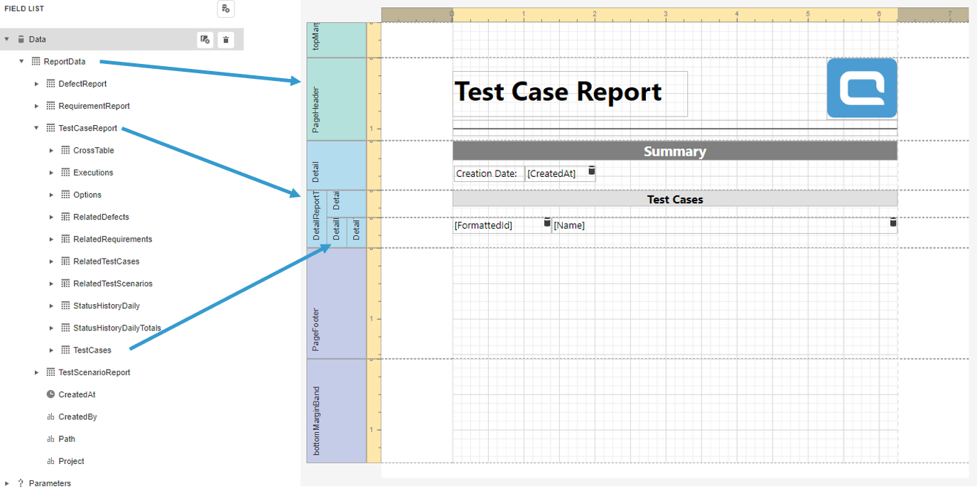 Innerhalb des hierarchischen Strukturbaumes gibt es Listen, Felder und berechnete Felder. Für jede Liste kann ein Band definiert werden, welches über die Elemente der Liste iteriert. Wird das übergeordnete Feld einer Liste direkt in den Report gezogen und kein Band dafür erstellt, so wird hierüber nicht iteriert, sondern lediglich das erste Element angezeigt. Dies wird nicht empfohlen. Berechnete Felder geben einen Wert auf Basis einer definierbaren Funktion zurück. Beispielweise kann ein berechnetes Feld erstellt werden, welches 1 zurückgibt, wenn eine Testausführung bestanden ist und 0, falls nicht. Dadurch können alle bestandenen Tests gezählt werden, ohne das ein aufwändiges Skript benötigt wird.