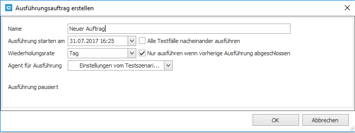 Ein Auftrag wird durch ein Anfangsdatum und einen Agenten, der genutzt wird, definiert. Zusätzlich kann die Wiederholungsrate in Tagen, Stunden und Minuten ausgewählt werden. Wenn der Auftrag fertiggestellt ist, muss er mit dem Button Start aktiviert werden.
