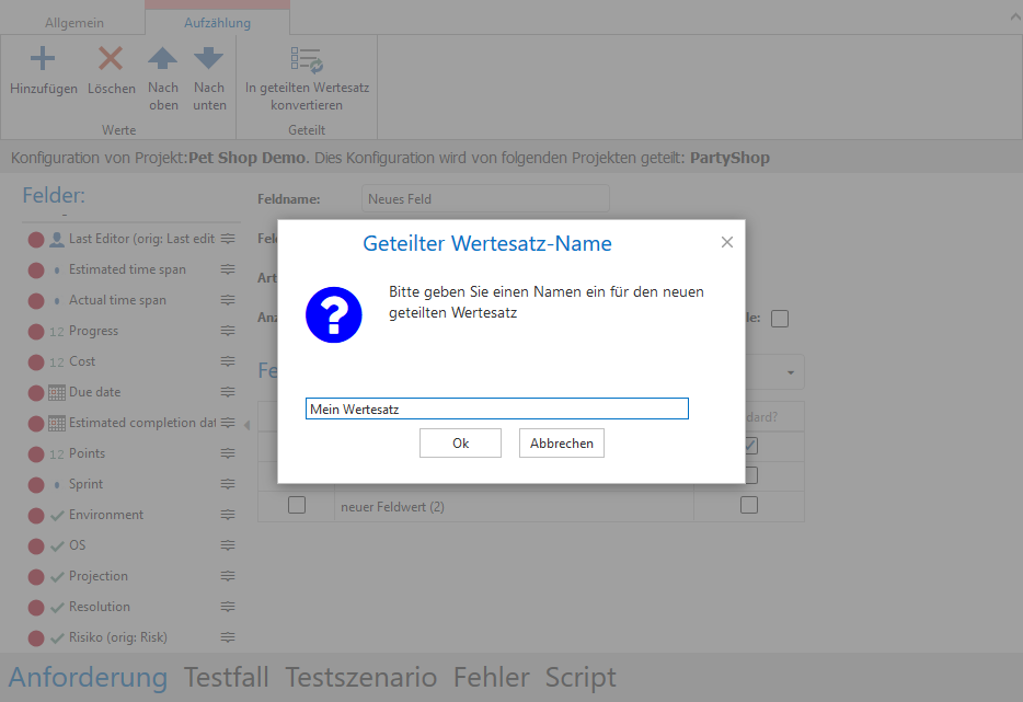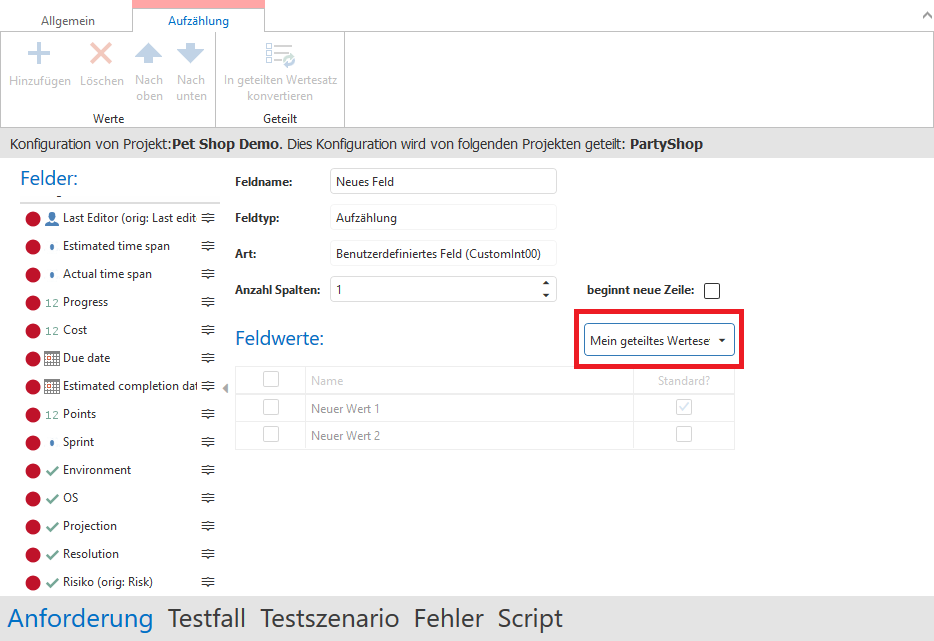 Außerdem können Sie eine existierende, individuelle Wertevorlage in eine geteilte konvertieren. Dazu selektieren Sie ein existierendes Feld vom Typ Aufzählung oder erstellen ein neues.