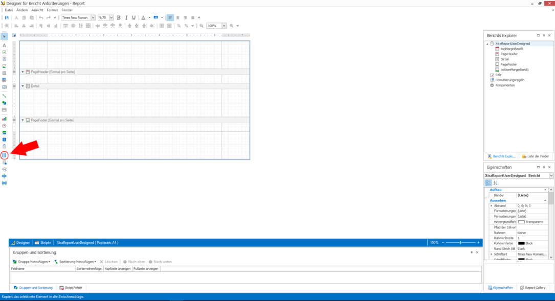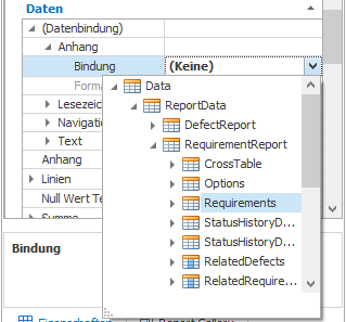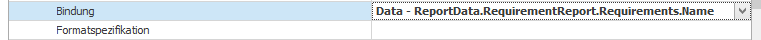 Dort definieren Sie die Bindung in (Datenbindung)->Lesezeichen. Dann definieren Sie dies, indem Sie Data->ReportData->RequirementReport->Requirements->Name benutzen.