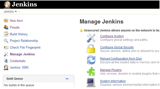 Das Jenkins Plugin wird als Datei mit dem Namen "aquaJenkinsPlugin.hpi" geliefert. Um dieses Plugin zu installieren, öffnen Sie bitte das Jenkins Dashboard und wählen Jenkins verwalten auf der linken Seite. Dann wählen Sie Plugins verwalten in der Mitte des Fensters.