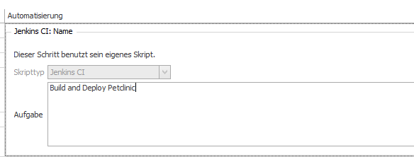 Um einen Job in Jenkins von aqua anzusteuern, erstellen Sie bitte einen neuen Testfall in aqua. Geben Sie Ihrem neuen Testfall einen Namen und öffnen den Schrittplaner über die Ribbon Bar. Nun wählen Sie den Tab Automatisierung und fügen ein neues Jenkins-Skript in den entsprechenden Testschritt ein. Im Eingabefeld namens Skript geben Sie einfach den Namen des Jobs in Jenkins ein.