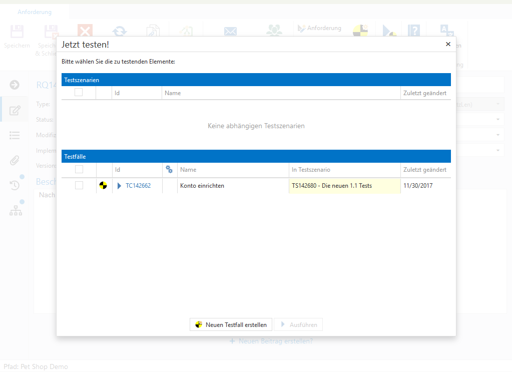 Das Jetzt testen! Feature lässt Sie Elemente mit abhängigen Testfällen oder Testszenarien direkt testen. Öffnen Sie einfach ein Element, zum Beispiel eine Anforderung oder einen Fehler, mit einem abhängigen Testfall oder -szenario. Klicken Sie den Button im Ribbon. Sollte noch kein Testfall oder -szenario definiert sein, so öffnet sich ein neuer Testfall, den Sie dann spezifizieren und ausführen können. Existiert genau ein abhängiger Testfall oder -szenario, so wird die Testausführung für diesen Testfall bzw. -szenario direkt gestartet. Bei mehreren Testfällen oder -szenarien öffnet sich ein Fenster, in dem Sie abhängige Testfälle oder -szenarien auswählen und ausführen können.