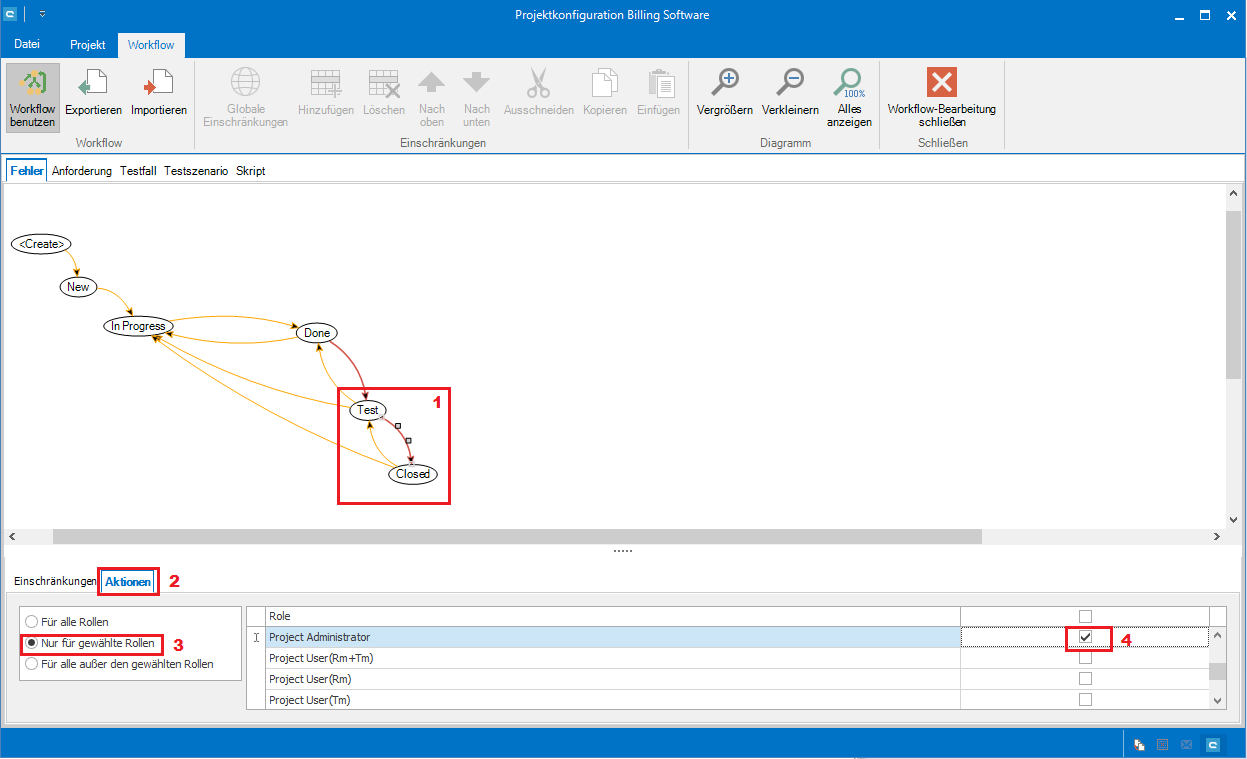 Sie können eine Aktionseinschränkung so konfigurieren, dass der Status nur von einem Nutzer aus einer bestimmten Rolle geändert werden kann. Wir wollen, zum Beispiel, dass das Feld Status nur vom Projekt Administrator auf Abgeschlossen gesetzt werden kann. Um diese Einschränkung zu erstellen, klicken Sie auf den Übergangspfeil und die Tabelle Aktion wird angezeigt. Klicken Sie auf den Tab Aktion in der Tabelle Aktion. Wählen Sie Nur für ausgewählte Rolle(n) und wechseln zu der Tabelle der existierenden Rollen. Finden Sie die Rolle Projekt Administrator und setzen Sie einen Haken in das Kästchen.