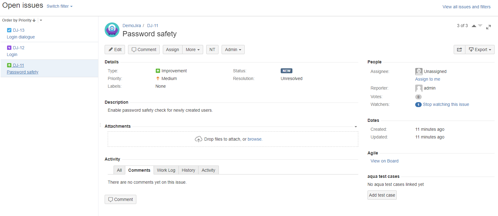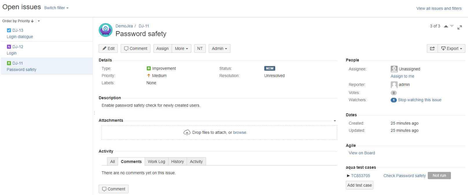 Wenn aqua4Jira korrekt konfiguriert wurde, sehen Sie Testfälle von aqua direkt in Ihrem Jira System.