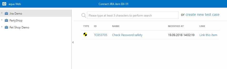 Eine Weiterleitung zu aqua erfolgt. Hier können Sie nach einem Testfall suchen oder einen von der Liste wählen. Um den Testfall zu verknüpfen, klicken Sie auf Link this item.