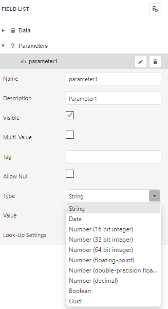 Wählen Sie in der Feldliste "Parameter" und klicken Sie auf . Ein Parameter wird hinzugefügt. Klicken Sie auf den kleinen Stift neben dem Namen des Parameters, um den Parameter zu bearbeiten.