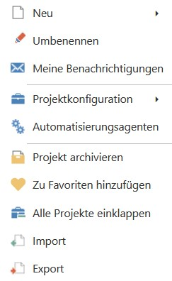 Über das Kontextmenü eines Projektes oder Ordners (Rechtsklick) können Sie das Projekt umbenennen, konfigurieren, archivieren, als Favorit hinzufügen/entfernen oder auch neue Elemente wie Anforderungen, Testfälle, Testszenarien, Fehler oder Ordner erstellen bzw. importieren sowie die enthaltenen Elemente exportieren. Über Meine Benachrichtigungen können Sie Ihre Benachrichtigungseinstellungen für das ausgewählte Projekt oder den ausgewählten Ordner individuell anpassen. Bei Ordnern können Sie zusätzlich über das Kontextmenü diese ausschneiden, kopieren, einfügen oder löschen.