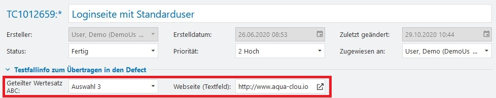 Als Beispiel sehen Sie hier eine Übertragung von einem Auswahlfeld (mit geteiltem Wertesatz) sowie einem Textfeld von einem Testfall in einen Fehler: