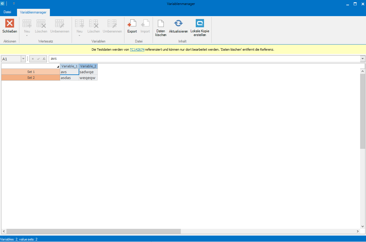 Sollen zwei oder mehr Testfälle die Testdaten teilen, können diese geteilt werden. Dazu öffnen Sie den Testfall, der die Werte aus einem anderen Testfall beziehen soll. Öffnen Sie den Variablenmanager. Wählen Sie den Testfall aus, dessen Daten Sie verwenden wollen und ziehen Sie ihn in die freie Fläche.