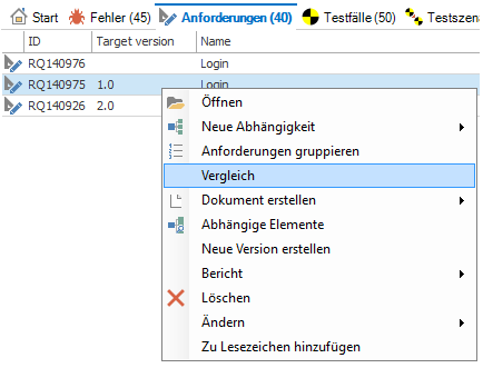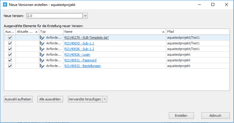 aqua bietet dem Benutzer die Möglichkeit, Versionen aller Elemente zu verwalten, wie Anforderungen, Fehler, Testfälle und Testszenarien. Dies erlaubt es Ihnen, prüffähige Anforderungen, Testfälle und Fehler zu speichern. Es ermöglicht Ihnen, mit verschiedenen Version von Elementen zu arbeiten und alte Dokumentenstatus von einzelnen Elementen wiederherzustellen. Änderungen können einfach vom Softwarezyklus verfolgt werden und werden visuell angezeigt. Neue oder alternative Versionen von Elementen können verwaltet werden.