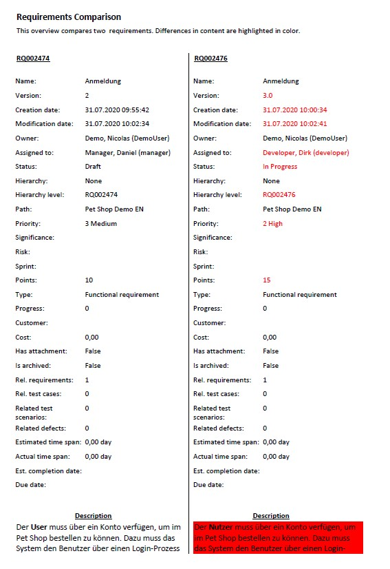 Wenn Sie im Kontextmenü für Anforderungen den Punkt Vergleich auswählen, generiert aqua einen sogenannten DiffReport, welcher die Unterschiede zwischen zwei Anforderungen farblich hervorhebt. Wenn der Button ausgegraut ist, müssen Sie noch die "DiffReports.aquarep" Berichtsvorlage im aqua Berichtsmodul importieren. Ebenso können auch Versionen von Testfällen verglichen werden. Hierfür wird die Berichtsvorlage "DiffReportsTC.aquarep" benötigt. Die Berichtsvorlagen können Sie hier herunterladen. Die Berichtsvorlagen vergleichen alle Standardfelder und die Beschreibungen der beiden Elemente sowie bei Testfällen auch die dazugehörigen Schritte inklusive der einzelnen Schrittbeschreibungen. Die Berichtsvorlagen dürfen nicht umbenannt werden. Sofern Sie den Bericht auf Ihre Bedürfnisse anpassen wollen, können Sie