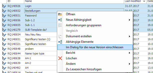 Sie können die Auswahl der Elemente für die Erstellung einer neuen Version expandieren, indem Sie mehrere Elemente im Element-Browser auswählen und auf Einfügen in Versionsdialog im Kontextmenü klicken.
