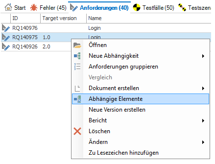 Die Abhängigkeiten der einzelnen Elemente können auch im Kontextmenü oder über den Abhängigkeiten Button eingesehen werden. Er zeigt an, welches Element die neuere, ältere oder alternative Version ist.