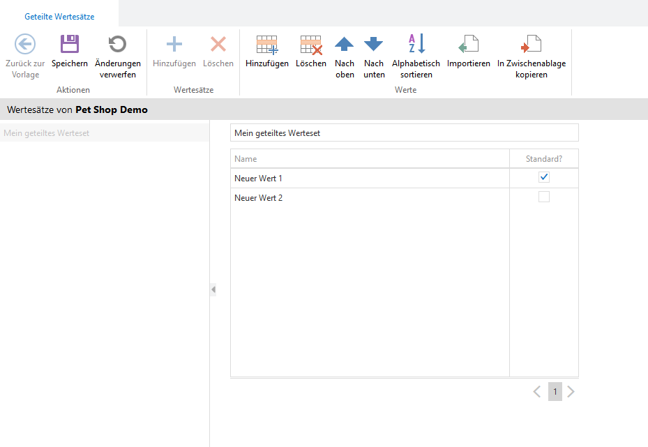 . Hier können Sie eine neue Wertevorlage erstellen, welche in verschiedenen Elementen oder Feldern genutzt werden kann. Klicken Sie auf