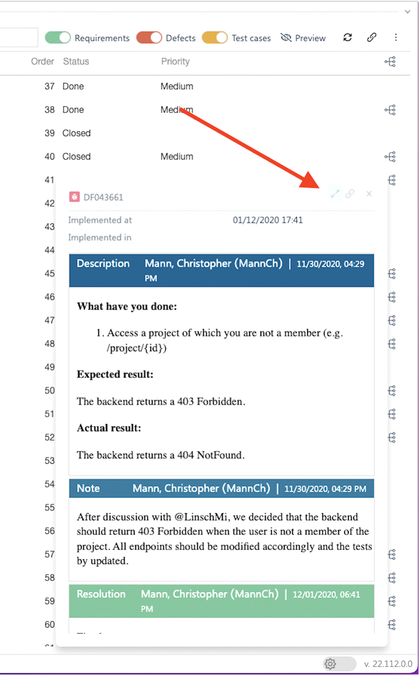 Wenn Sie das Element öffnen müssen, um Kommentare oder Abhängigkeiten zu prüfen, klicken Sie einfach auf das Symbol „Erweitern“, und das Objekt wird in einem separaten Tab geöffnet.